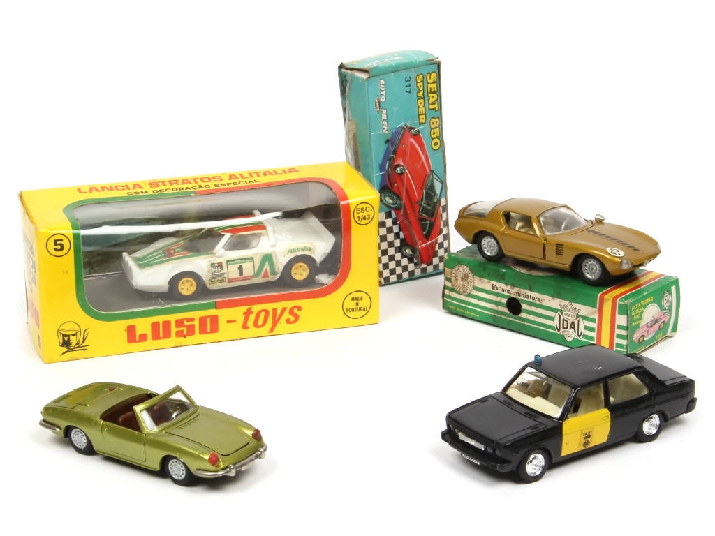 comprend : GIULIA 1600, SEAT 850, 131E & LANCIA STRATOS - on y retrouve les marques : MIRA, LUSO-TOYS, AUTO PILEN & JOAL - 3 modèles en boite en états 'b' à 'e'