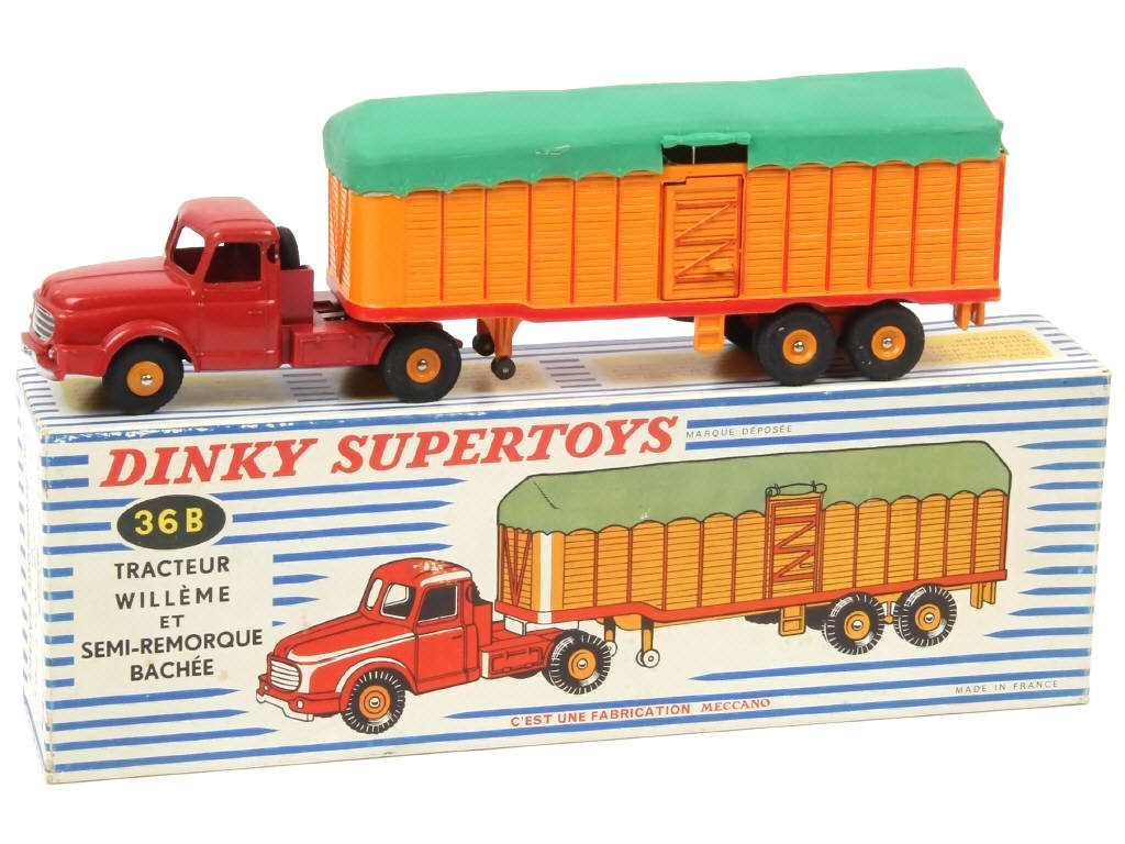 DINKY TOYS (FRANCE) 36B WILLEME Semi-remorque bâché (version avec jantes convexes) rouge & orange, bâche verte