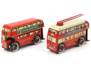 WELLS-BRIMTOY (GB) Ensemble d'un autobus & un trolley londoniens en tôle lithographiée rouge, crème & noir