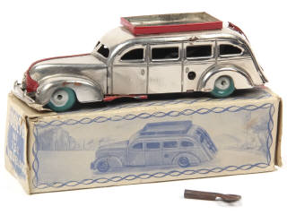 longueur 15,5 cm - fabrication en tôle - avec moteur à clef (fonctionne), clef & direction - quelques petites traces d'oxydation sur la carrosserie par endroits