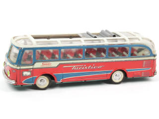 PAYA (ESPAGNE) 1709 Autocar en tôle lithographiée 'TURISTICO' rouge, bleu & blanc cassé