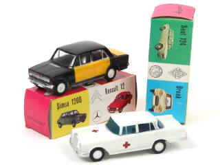 longueur : 14 cm - moteurs à friction (fonctionnent) - comprend : MERCEDES 220 ambulance & SEAT 124 taxi (une trace d'oxydation sur le plancher)