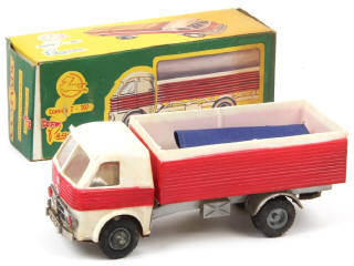 longueur : 19 cm - moteur à friction (fonctionne) - carrosserie encrassée - une fixation de réservoir cassée - quelques parties chromées ternies - légères traces d'oxydation par endroits - avec une bâche - boîte jaunie & tachée