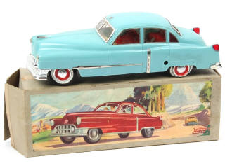 longueur : 35 cm - avec moteur à clef (à revoir, lamelle cassée), clef & direction - carrosserie & vitrage légèrement encrassés - pneus plus ou moins affaissés - boîte plus ou moins tachée avec quelques accrocs