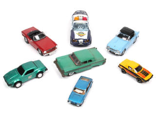 différentes grandes échelles - 2 moteurs à friction (fonctionne) & un modèle à moteur électrique pour circuit - on y retrouve les marques : SCALEXTRIC (GB), CORGI, TONKA & ERTL - quelques manques & parties cassées