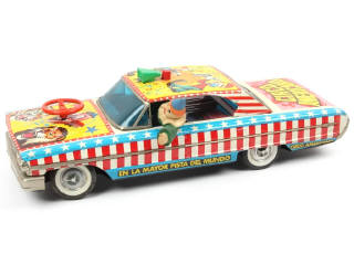 longueur 48 cm - avec moteur à piles (à revoir), bruiteur (à revoir) & direction actionnée par un volant situé sur le capot-moteur - quelques frottements & petites traces d'oxydation par endroits (intérieur de toit terni) - modèle légèrement encrassé