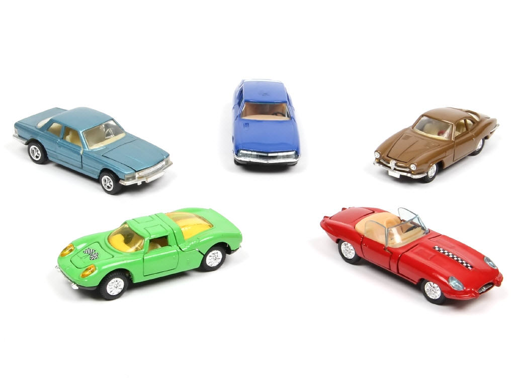 comprend les modèles : FERRARI, CITROEN, JAGUAR & ALFA ROMEO - on y joint une MERCEDES de la marque NACORAL - jantes plus ou moins fondues sur un modèle