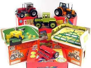 tracteurs reproduisant les marques : MERCEDES-BENZ, RENAULT & MASSEY FERGUSON - machines agricoles comprenant : un semoir à grains, une bateleuse & une charrue à rouleaux - 2 boîtes en état 'C'