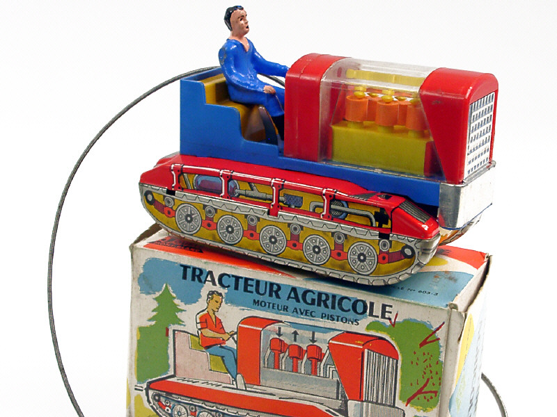 longueur 16,5 cm - en tôle lithographiée & plastique - moteur à clef (fonctionne) - avec clef - en action, un câble métallique avec une poignée de commande permet de diriger le tracteur, tandis que les pistons du moteur bougent
