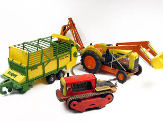 longueur 66 cm - moteur à piles (fonctionne) - en action, la télécommande agit sur la marche avant & arrière, ainsi que sur les 2 pelles - pistons du moteur fonctionnels - manque vraisemblablement le conducteur