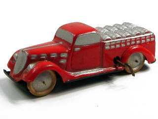 longueur 13 cm - véhicule en celluloïd - moteur à clef (à revoir) - plancher fendu - petites traces d'oxydation sur les parties métalliques