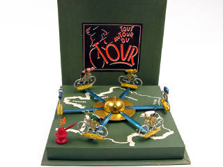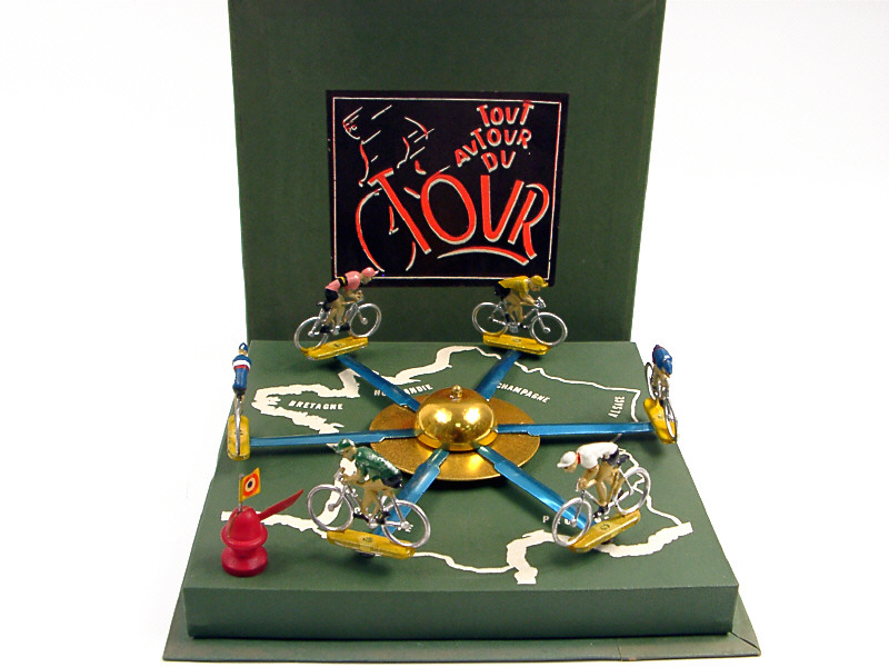 dimensions : 24,5 x 24,5 x 10 cm - le socle de la boîte comporte une carte de France sur laquelle est installée un tourniquet avec 6 cyclistes - en action, le fait de faire tourner le manège permet d'arrêter les cyclistes sur une région de France