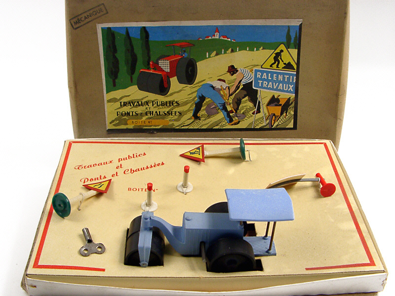 dimensions : 29.5 x 20 cm - contient un rouleau compresseur avec mécanisme à clef (fonctionne poussivement) - avec clef, 3 panneaux de signalisation & 2 bornes - légère déformation du plastique du rouleau compresseur - légère oxydation des parties métalliques