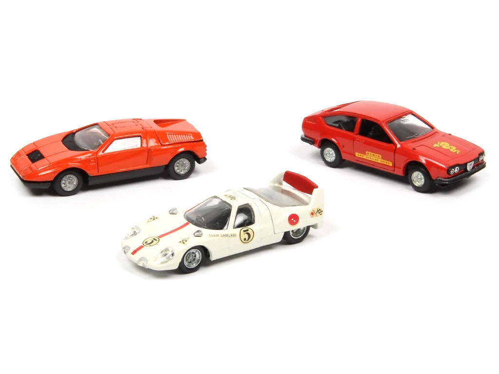comprend : MERCEDES BENZ C 111 & ALFA ROMEO ALFETTA GT (manque rétroviseurs) - on y joint une SAMURAÏ de la marque POLITOYS
