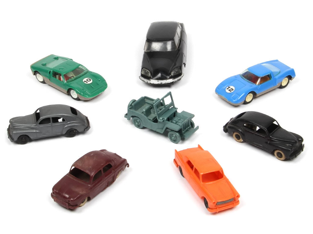 2 modèles avec marquage BONUX - fabrication en plastique - comprend notamment : CITROEN DS21, MATRA BRM, PEUGEOT 203 & RENAULT DAUPHINE - on y retrouve notamment les marques : CLE & MINIALUXE - avec manques & parties cassées - traces d'oxydation