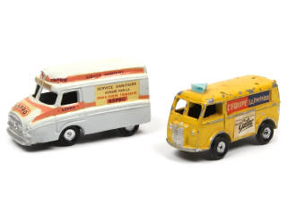 comprend : CITROEN H ambulance du Tour de France 'ASPRO' (version avec plancher en aluminium peint en noir - petits manques sur certains décalques) & PEUGEOT D4A 'VOITURE BALAI' (publicités 'PLASTIQUE GILAC - L'EQUIPE & LE PARISIEN' - avec manques)