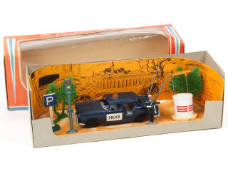 contient : PEUGEOT 404 'POLICE' (traces de colle d'origine sur le toit ,manque 2 petits haut-parleurs), policier & accessoires encore fixés sur leur socle - avec diorama - quelques accrocs, frottements & déformations sur la boite