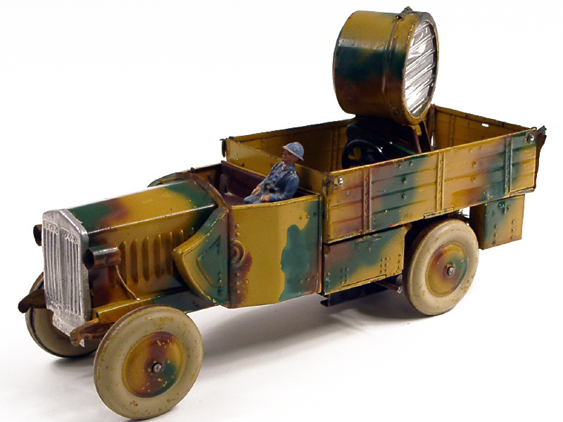 longueur 30 cm - moteur à clef (fonctionne) - avec direction, phares & projecteur électriques - les ridelles latérales & arrière s'abaissent - manque les ampoules - l'axe de roues arrière patine dans les moyeux de roues - 2 volants permettent d'orienter le projecteur - avec un soldat en composition - SUPERBE !