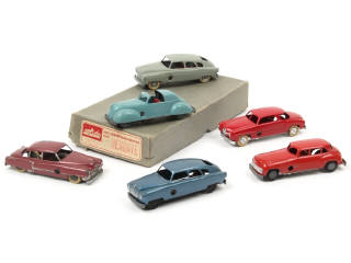 contient 6 modèles différents dont un motorisé (moteur fonctionne) - 2 exemplaires avec traces de métal fatigue & un autre avec traces d'humidité - pneus plus ou moins séchés - possibilité de modèles non conformes au coffret - la boite est en état 'b' (un rabat dégrafé - avec séparations)