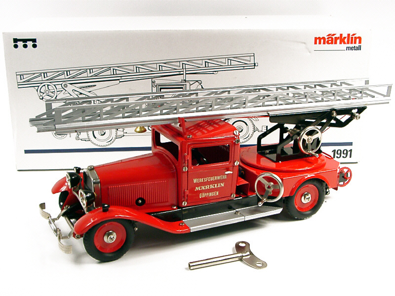 longueur 45,5 cm - moteur à clef (fonctionne) - avec éclairage des phares, direction par le volant, levier de marche/arrêt & 3 manivelles permettant l'extension, la montée & l'orientation de l'échelle - avec notice, clef, dérouleur & 2 pompiers - ce modèle est une réédition d'un camion fabriqué avant-guerre - SUPERBE REALISATION !