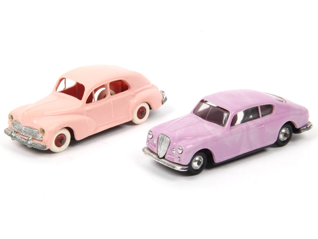 comprend : PEUGEOT 203 dans une couleur rose peu courante (plancher frotté en état 'D' - pare-chocs plus ou moins ternis - jantes décolorées) & LANCIA AURELIA avec coloris marbré façon STOCK-CAR (fêlures sur le vitrage - jantes plus ou moins fondues)