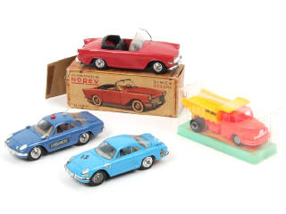 comprend : SIMCA OCEANE (état 'C' - importantes parties fondues sur le plancher - boite en état 'c'), ALPINE A110 sport (décalques ajoutés) & gendarmerie & BERLIET BENNE de la gamme MICRO (avec bulletin d'inscription au club (boite en état 'b') - quelques déformations