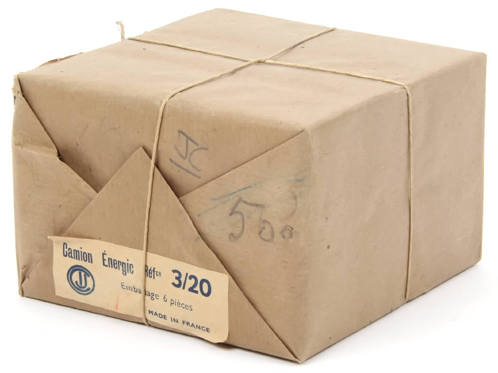 états supposés suivant la configuration - ensemble emballé à l'usine dans un papier kraft maintenu par une ficelle (avec étiquette de désignation collée sur un côté du paquet, 2 petites annotations au crayon de papier) - une petite perforation sur le papier d'emballage & une boîte (état 'b')