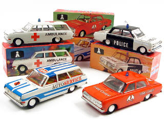 longueur des modèles 15,5 cm - comprend 2 limousines 'POLICE' & 'FIRE CHIEF' ainsi que 2 kombi 'AMBULANCE' & 'AUTOSERVICE' - moteurs à friction (fonctionnent)
