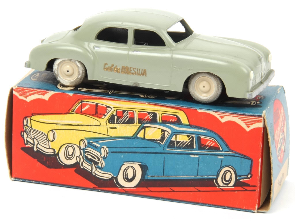 moteur à friction (fonctionne) - la mention 'Cafés BRESILIA' est gravée en lettres dorées sur le côté droit de la voiture - ce modèle promotionnel pouvait être obtenu en échange de points que l'on trouvait à l'époque dans les paquets de café de la marque - pneus salis - carrosserie très légèrement déformée - petites annotations sur un rabat de boîte