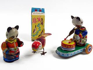 longueur 13,5 cm - moteur à clef (fonctionne) - en action, le chariot avance tandis que le panda tape sur son tambour en hochant la tête