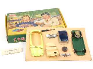 échelle 1/32ème - dimensions du coffret : 29 x 18,5 cm - contient : carrosserie, toit avec vitrage (avec une fêlure), aménagement intérieur, pare-chocs avant & arrière, châssis (avec moteur à friction à revoir), boîte de fixations, bon de contrôle & cale de présentation - traces de métal fatigue sur les jantes - ensemble encrassé - quelques manques de papier sur la boîte