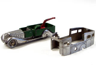 modèle de 1937/42 - châssis avec marchepieds & ailes aérodynamiques recouvrant les roues arrière - roues en zamac & capot droit avec 5 volets verticaux sur les côtés - traces de métal fatigue sur les roues & le châssis - avec un manque sur l'aile arrière droite - on y joint une carrosserie chromée d'autocar 'LONDRES-COTE D'AZUR'
