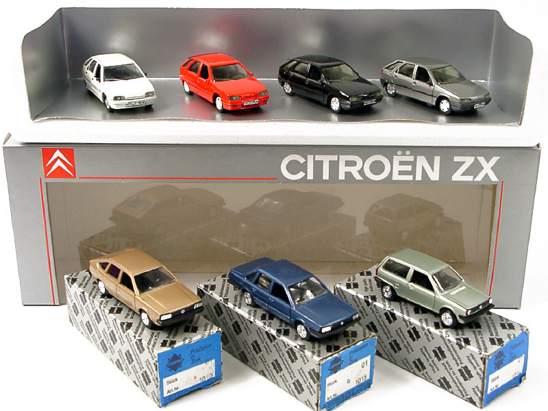 comprend 4 CITROËN ZX dont une REFLEX blanche, une VOLCANE rouge, une AURA noire & une AVANTAGE grise métallisée - PROMOTIONNEL CITROËN réalisé lors de la sortie de la ZX