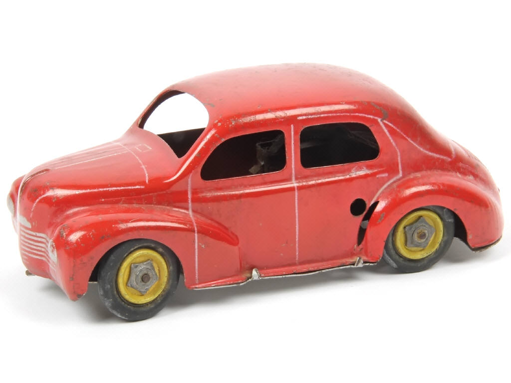 longueur 18 cm - version de 1949 sans pare-choc ni siège avec calandre à 6 barres - avec moteur à clef (fonctionne) & direction - quelques traces d'oxydation par endroits (principalement sur le moteur)