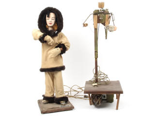 bel automate de la prestigieuse fabrique JAF (Jouets Automates Français) - fabrication 1930-1940 - système életrique non testé - hauteur totale : 60 cm environ - présenté sur socle en bois avec étiquette de désignation JAF - costume ancien d'ESQUIMAU avec veste, pantalon & gants (petites restaurations) & fourrure - tête en composition avec nombreuses craquelures - perruque en laine & yeux en sulfure avec paupières - bon état général malgré quelques traces d'usure - on y joint un châssis motorisé d'automate probablement de la même marque (non testé) avec axe, un reste de main & les yeux