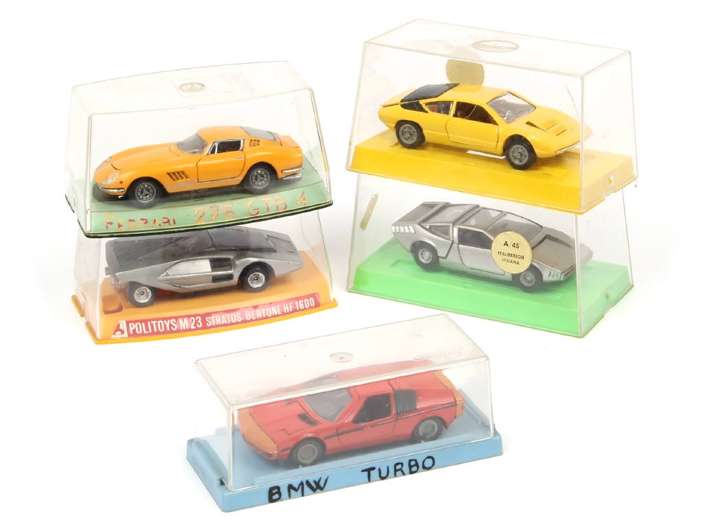 comprend les modèles : LAMBORGHINI, BMW, ALFA ROMEO, FERRARI & LANCIA - on y retrouve les marques : MEBETOYS, POLITOYS & SCHUCO - quelques boîtes en état 'c' dont certaines avec détails de peinture ajoutés (manque quelques fixations de socle)