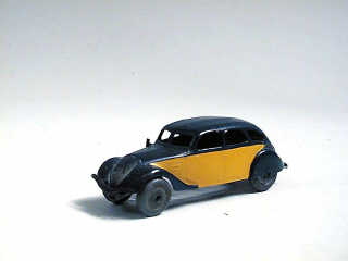DINKY TOYS (FRANCE) 24L PEUGEOT 402 'TAXI' (version sans plancher & avec roues zamac) bleu soutenu & jaune d'or