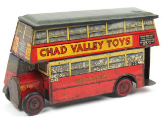 CHAD VALLEY (GB) Bus londonien 'CHAD VALLEY TOYS' en tôle lithographiée rouge, jaune & noir