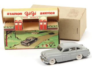 fabrication de 1956 - version sans aménagement intérieur ni moteur à friction - une fêlure sur le bas de caisse avant - carrosserie très légèrement déformée - avec rare boîte illustrée représentant une station service, suremballage & carte de visite 'ETS BRUSSON JEUNE - VILLEMUR' (spécialisée dans la fabrication de biscuits, biscottes & pâtisseries de conservation, légèrement tachée) - offert vraisemblablement à leurs fidèles clients