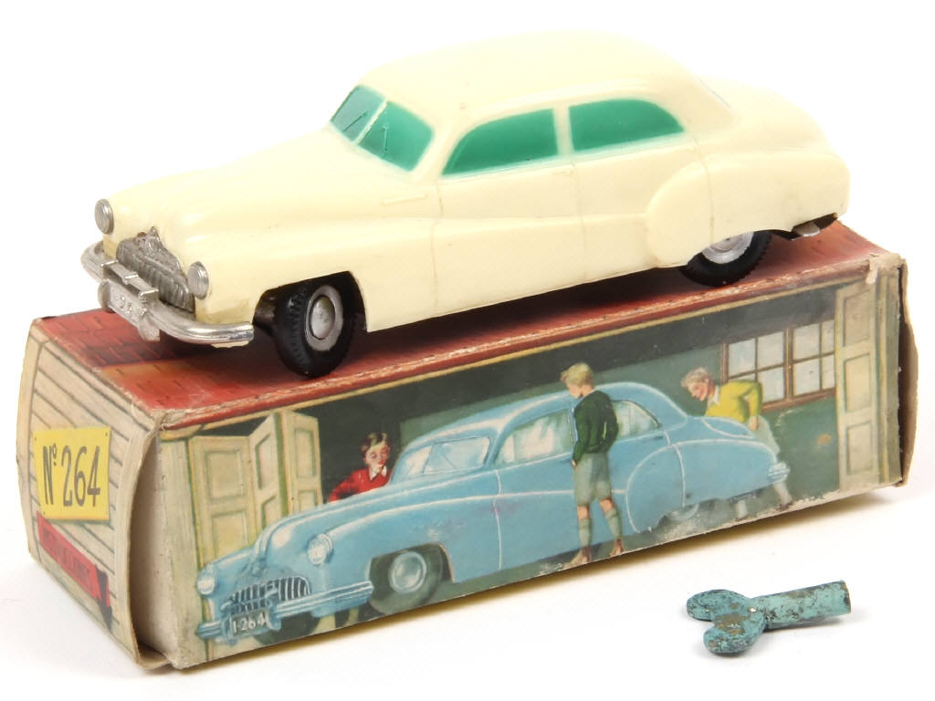 longueur 13,5 cm - avec moteur à clef (fonctionne), clef (oxydée) & direction - voiture réalisée en plastique très inspirée du modèle fabriqué par PRÄMETA - sans poignée de malle arrière (d'origine) - carrosserie légèrement encrassée - petites traces d'oxydation sur le plancher - traces de métal fatigue sur le pare-choc arrière avec un petit manque (désolidarisé) - avec sa rare boîte-garage (légèrement encrassée avec traces d'humidité plus ou moins importantes)