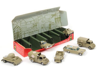 états de 'A' à 'B' - contient : 2 camions bâchés, un plateau, une JEEP WILLYS, CHEVROLET CHEVELLE break, PLYMOUTH BARRACUDA & un engin blindé - 2 exemplaires de la marque GAMDA KOOR - quelques petites craquelures sur certains décalques - boîte très légèrement déformée (avec séparations)