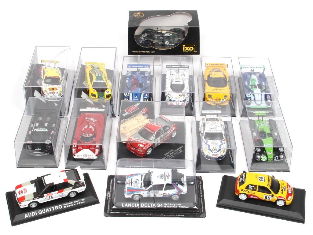 modèles principalement vendus en kiosque - comprend notamment les modèles : PORSCHE, DALLARA, LANCIA & AUDI - on y retrouve notamment les marques : IXO & VITESSE - quelques petits manques, parties cassées & à recoller - quelques boites en états 'c' & 'd'