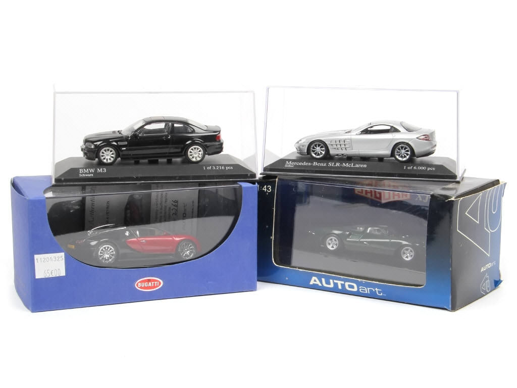 comprend les modèles : BUGATTI (avec certificat d'édition limitée 2766), MERCEDES, JAGUAR & MERCEDES - on y retrouve les marques : AUTOART & MINICHAMPS (suremballage manquant)
