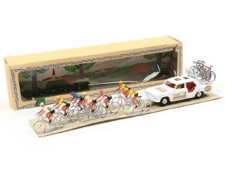 contient : une PEUGEOT 404 'PEUGEOT' porte-vélos (avec 3 vélos dont un avec cadre peint) & 7 coureurs cyclistes (états de 'A' à 'B') - ensemble fixé sur socle de présentation (3 vélos décollés) - blister de boîte en grande partie manquant (déchirures plus ou moins importantes)