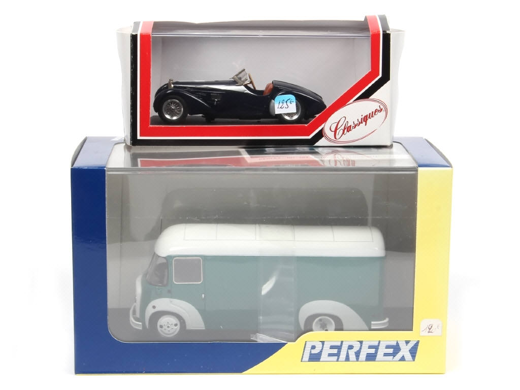 comprend : BUGATTI T57 SC CORSICA Col.GILES 1938 & CITROEN T23 RHLZ ROBUSTACIER 1958 fourgon de marche (distribué par MOMACO) - on y retrouve les marques : CLASSIQUES & PERFEX - une boite plus ou moins déformée