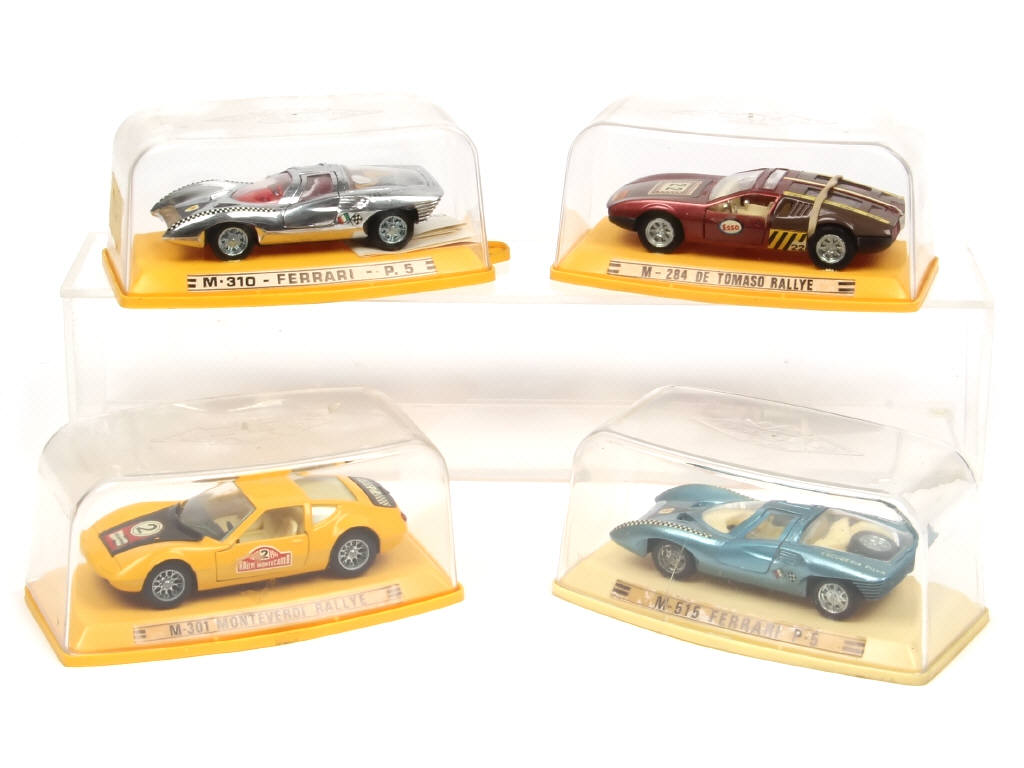 comprend les modèles : FERRARI, MONTEVERDI & DE TOMASO - quelques pneus collés sur les socles de boite avec quelques traces d'humidité sur certaines étiquettes