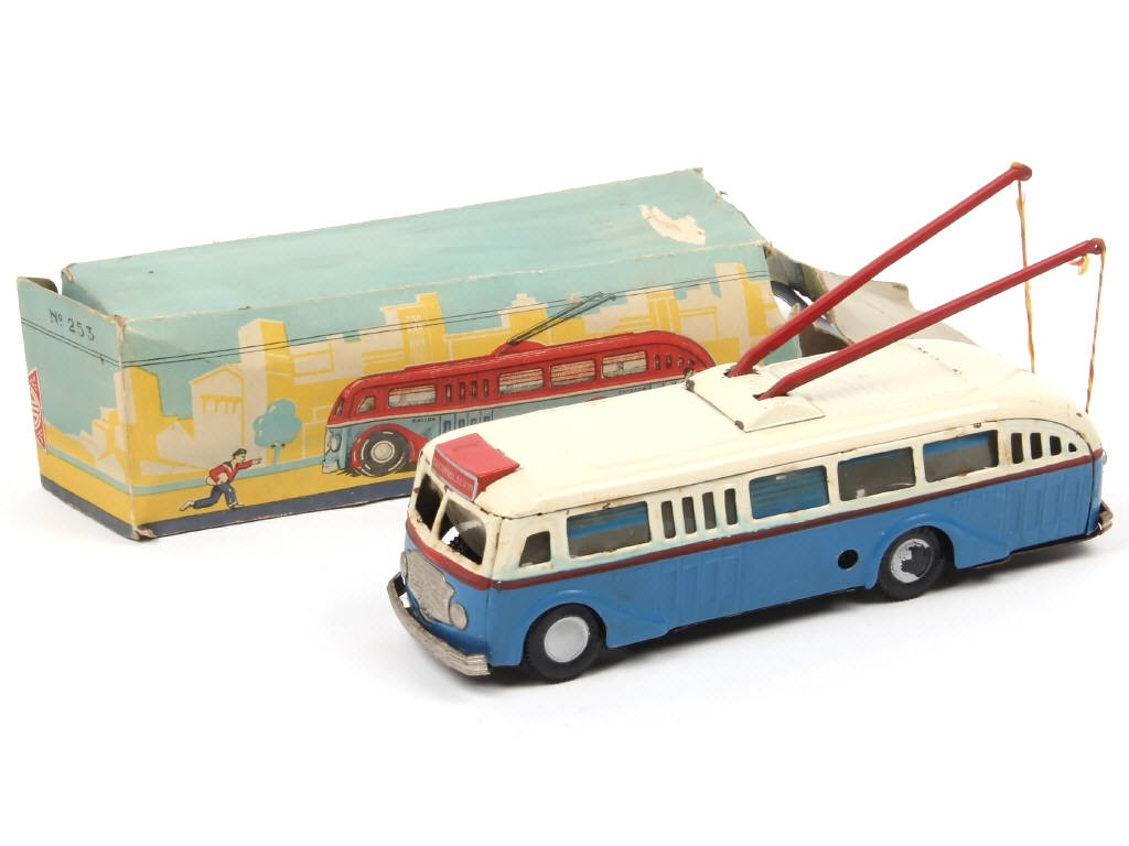 JYESA (ESPAGNE) 253 Trolley-bus en tôle peinte bleu, blanc cassé & rouge