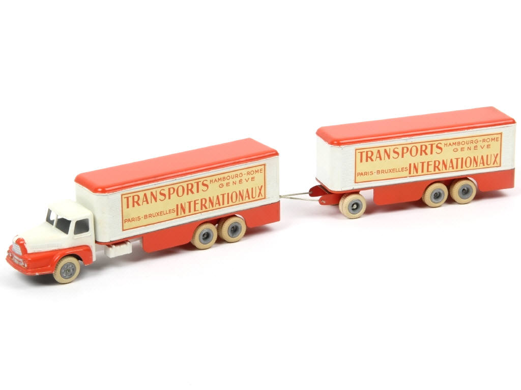 JRD (FRANCE) 127 UNIC LAUTARET 'TRANSPORTS INTERNATIONAUX' avec remorque orange & blanc