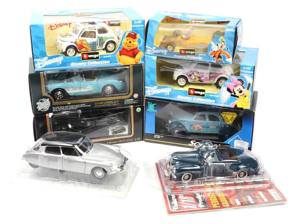 différentes échelles (1/24e & 1/18e) - on y retrouve les marques : BBURAGO, SOLIDO, MAISTO, ROAD TOUGH & HACHETTE - comprend notamment les modèles : PEUGEOT, CITROËN, CHEVROLET & FIAT - 3 véhicules DISNEY - boîtes en états 'b' à 'c' - possibilité de manques & parties cassées