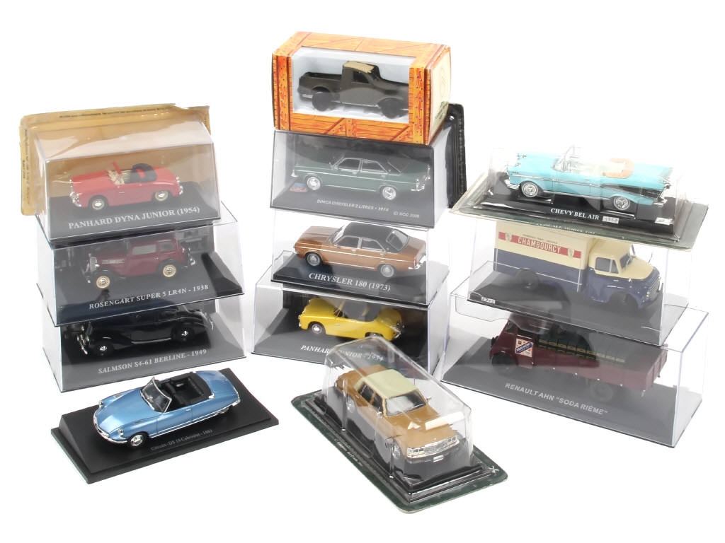 modèles vendus en kiosque - miniatures reproduisant les modèles : CADILLAC, PANHARD & RENAULT - un exemplaire avec vitrage fêlé, un avec couvercle de boîte manquant & un autre avec une roue à recoller - une boîte en état 'c'